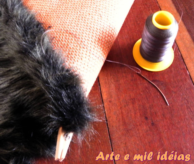 Mas aí passando por uma loja de tecidos vi na vitrine vários tecidos apeluciados e tive a idéia de reciclar o tapete velho!